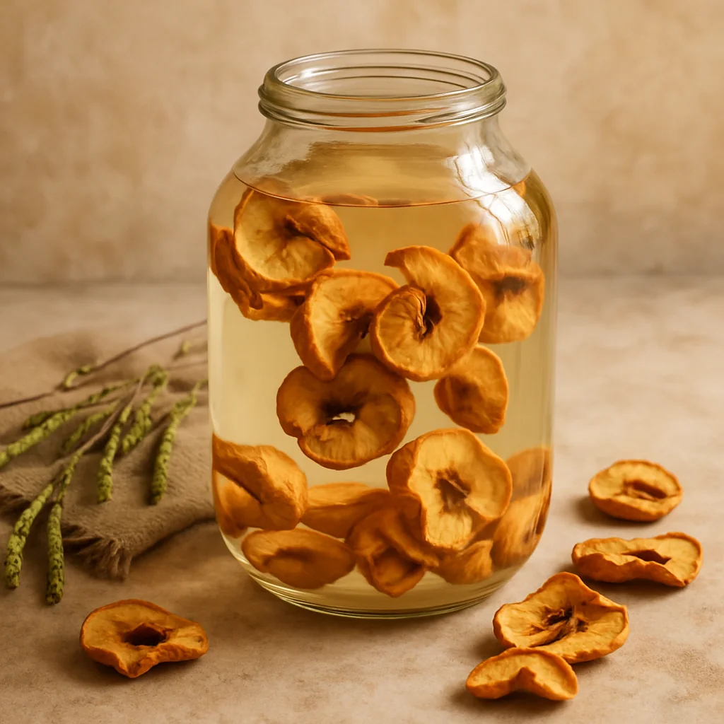 Birch sap with dried apples is a comforting seasonal drink with a mild fruity flavor and natural sweetness.