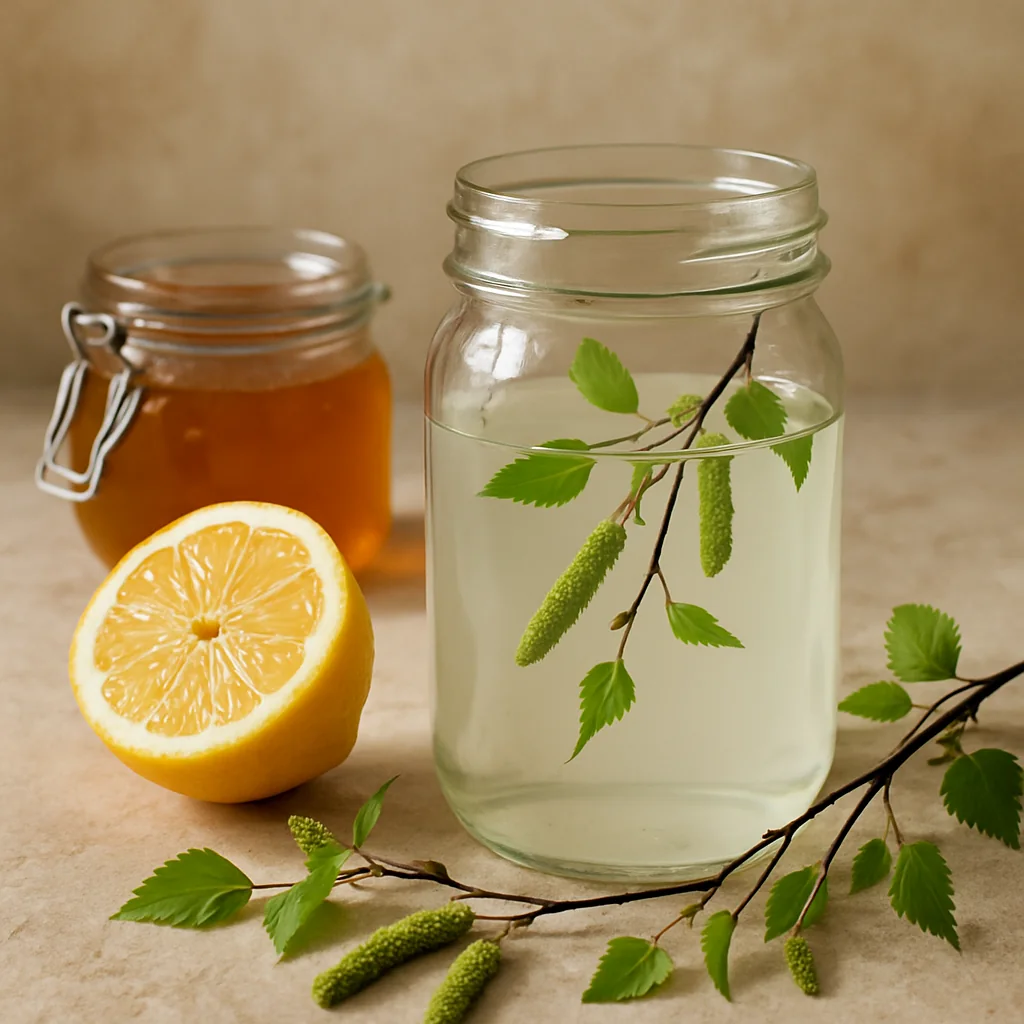 Birch sap with honey and lemon is a refreshing seasonal drink with a light citrus note and natural sweetness.