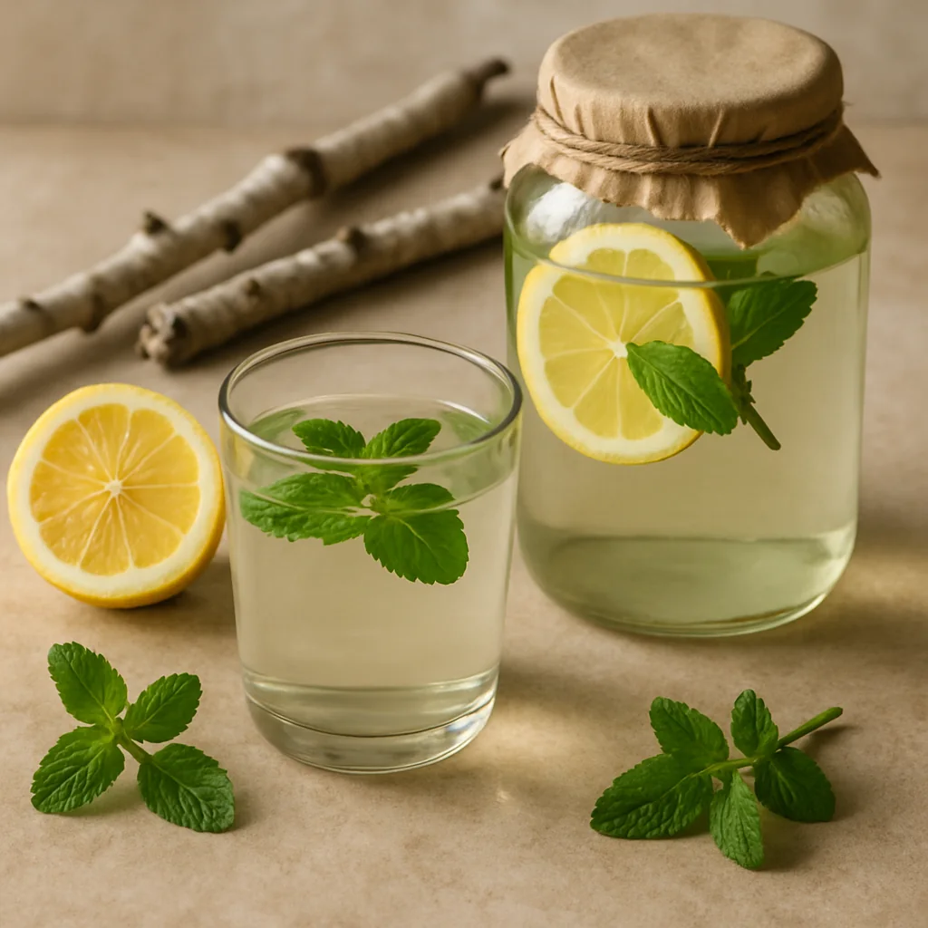 Birch sap with lemon and mint is a refreshing seasonal drink with a light citrus and herbal aroma, perfect for spring.