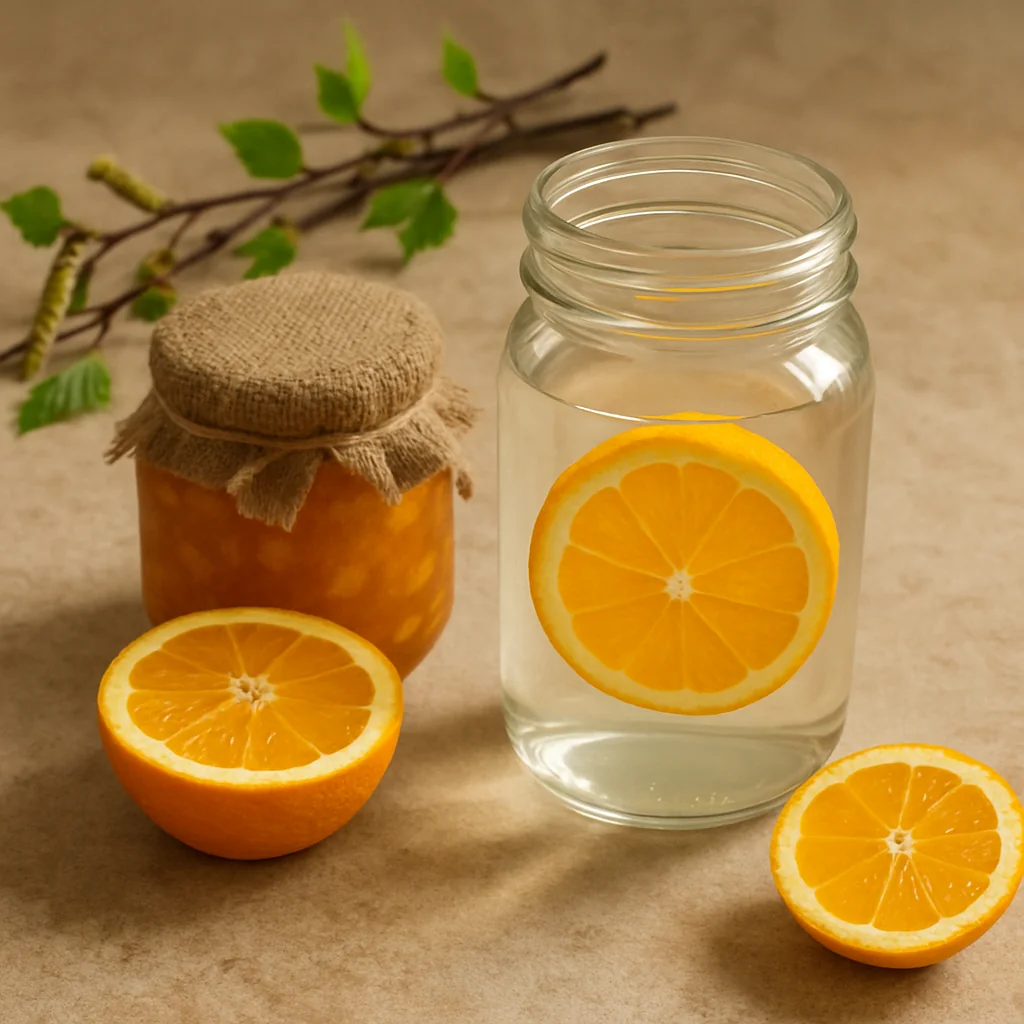 Birch sap with orange is a seasonal drink with a delicate citrus flavor, ideal for spring and short-term storage.