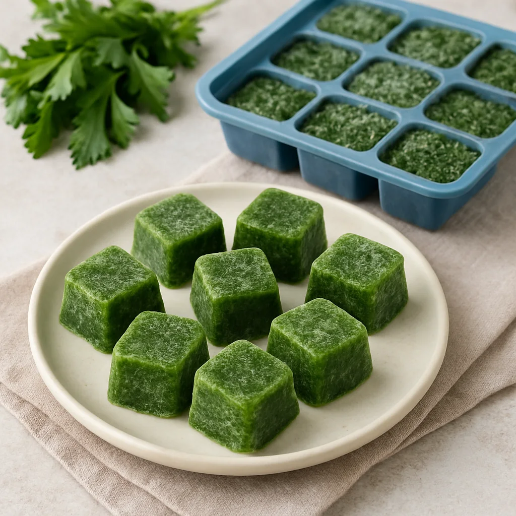 Freezing herbs in cubes is a practical way to preserve seasonal greens. The portioned format makes it easy to add directly to soups, sauces, and cooked dishes.
