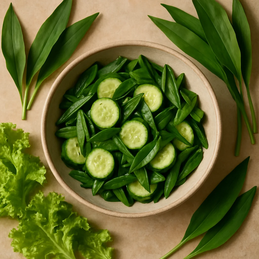 Lightly salted cucumbers with wild garlic are a crisp, fresh, and aromatic spring appetizer.
