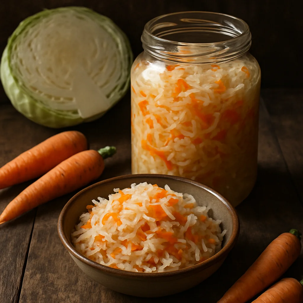 Classic sauerkraut with carrots is a simple fermented dish with a rich, traditional homemade flavor.