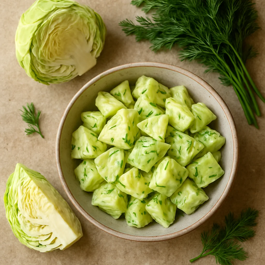Marinated young cabbage chunks are a quick and fresh spring appetizer with a light, crisp texture.