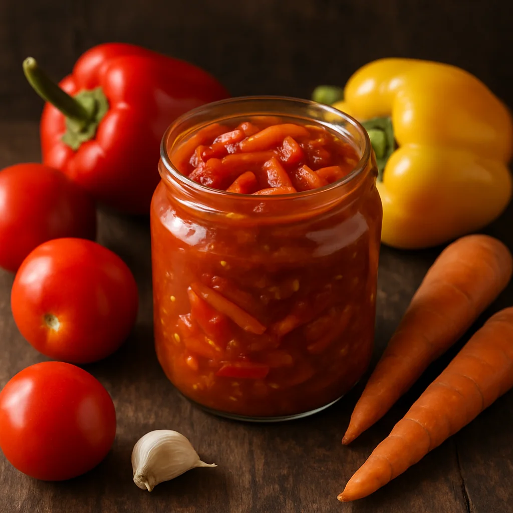 Pepper and tomato lecho is a classic homemade vegetable preserve with a rich, balanced flavor.