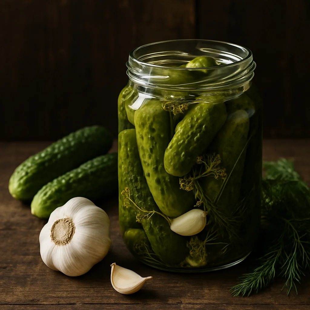 Crispy pickled cucumbers with garlic and dill are a classic homemade preserve, perfect for everyday meals and long-term storage.