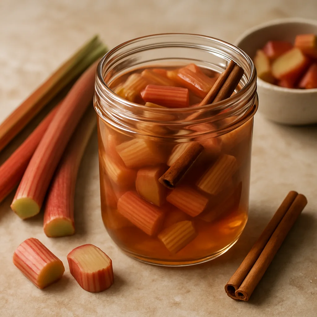Rhubarb is a classic spring ingredient with a bright tart flavor, ideal for sweet preserves. Cinnamon adds warmth and depth, while the syrup itself can be used separately for drinks and desserts.
