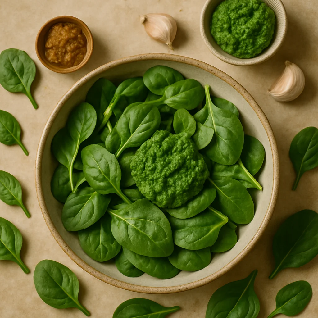 Spinach and garlic paste is a simple and versatile recipe made from fresh seasonal ingredients, ideal as a spread, sauce base, or addition to various dishes.