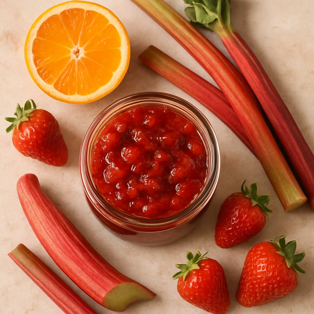 A vibrant spring jam made with strawberries, rhubarb, and orange, with a rich flavor and excellent seasonal appeal.