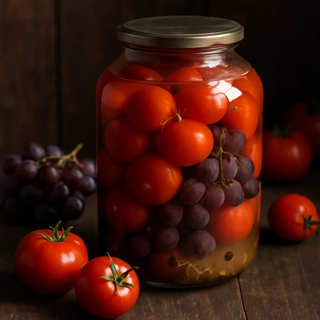 Pickled tomatoes with grapes are a unique homemade preserve with a balance of sweet and tangy flavors.